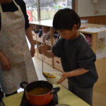 2月の食育活動は、春のお彼岸に関連したぼたもち作りをしました。 保育者が大豆をミキサーにかけてきなこを作って見せると、驚いて歓声が上がっていました。 あんこときなこの二色のぼたもちを作り、みんなでおいしくいただきました。