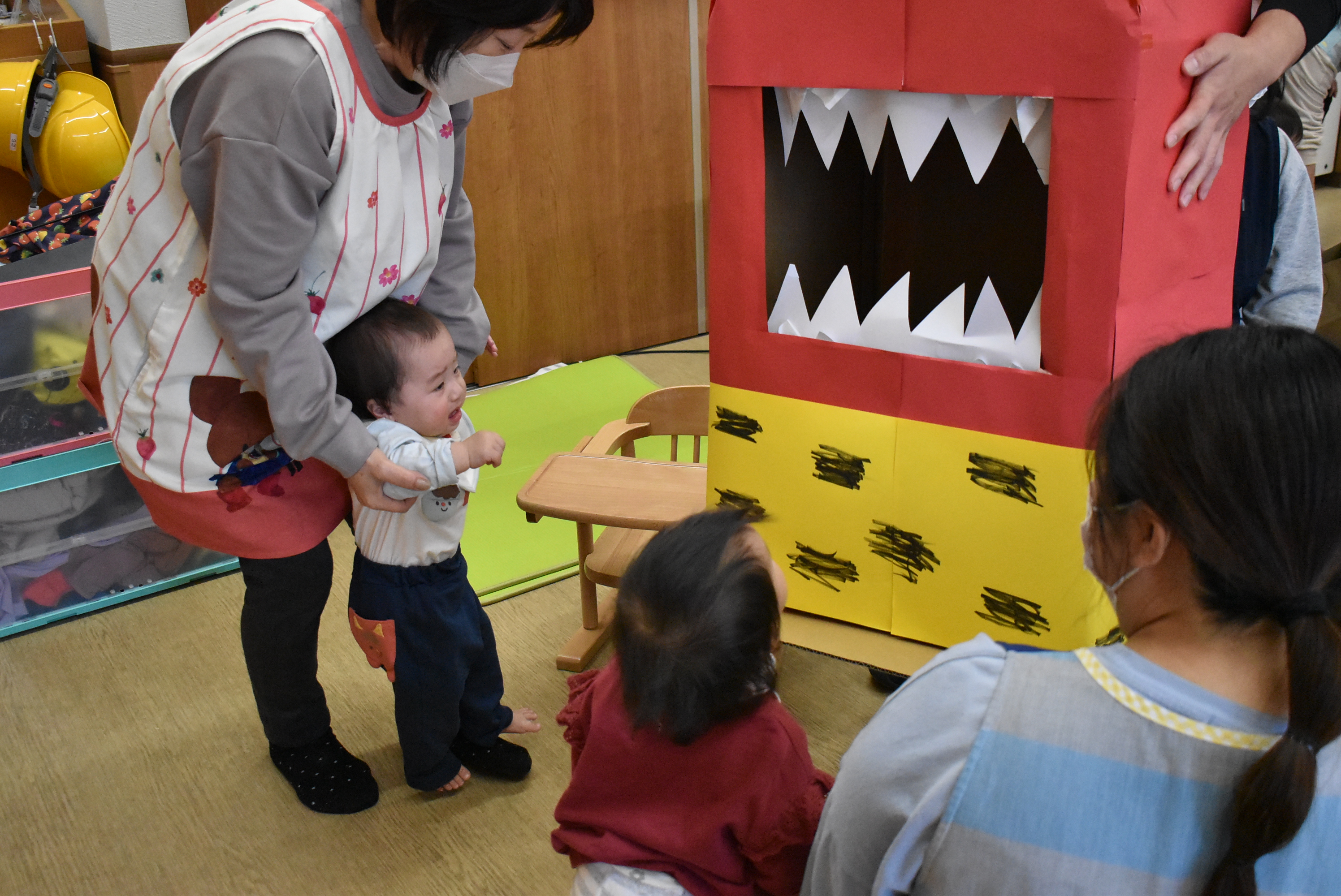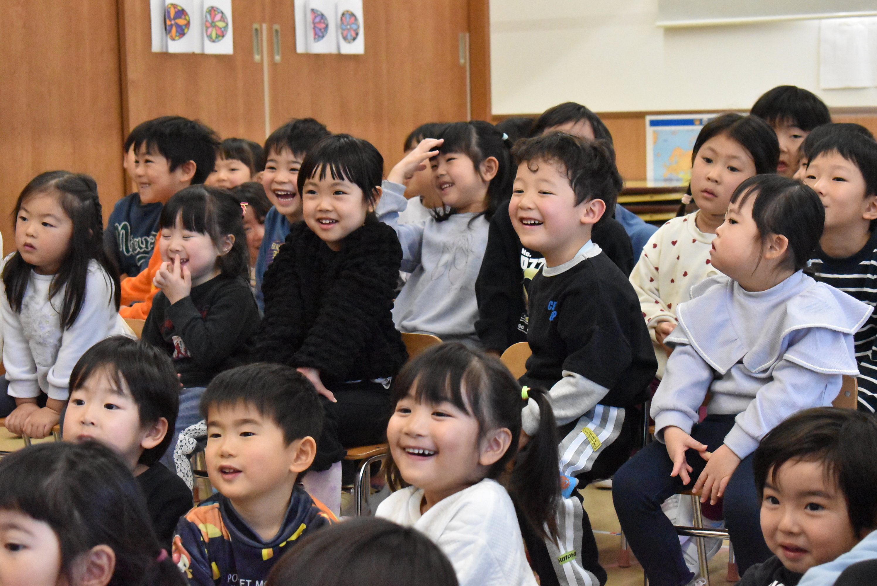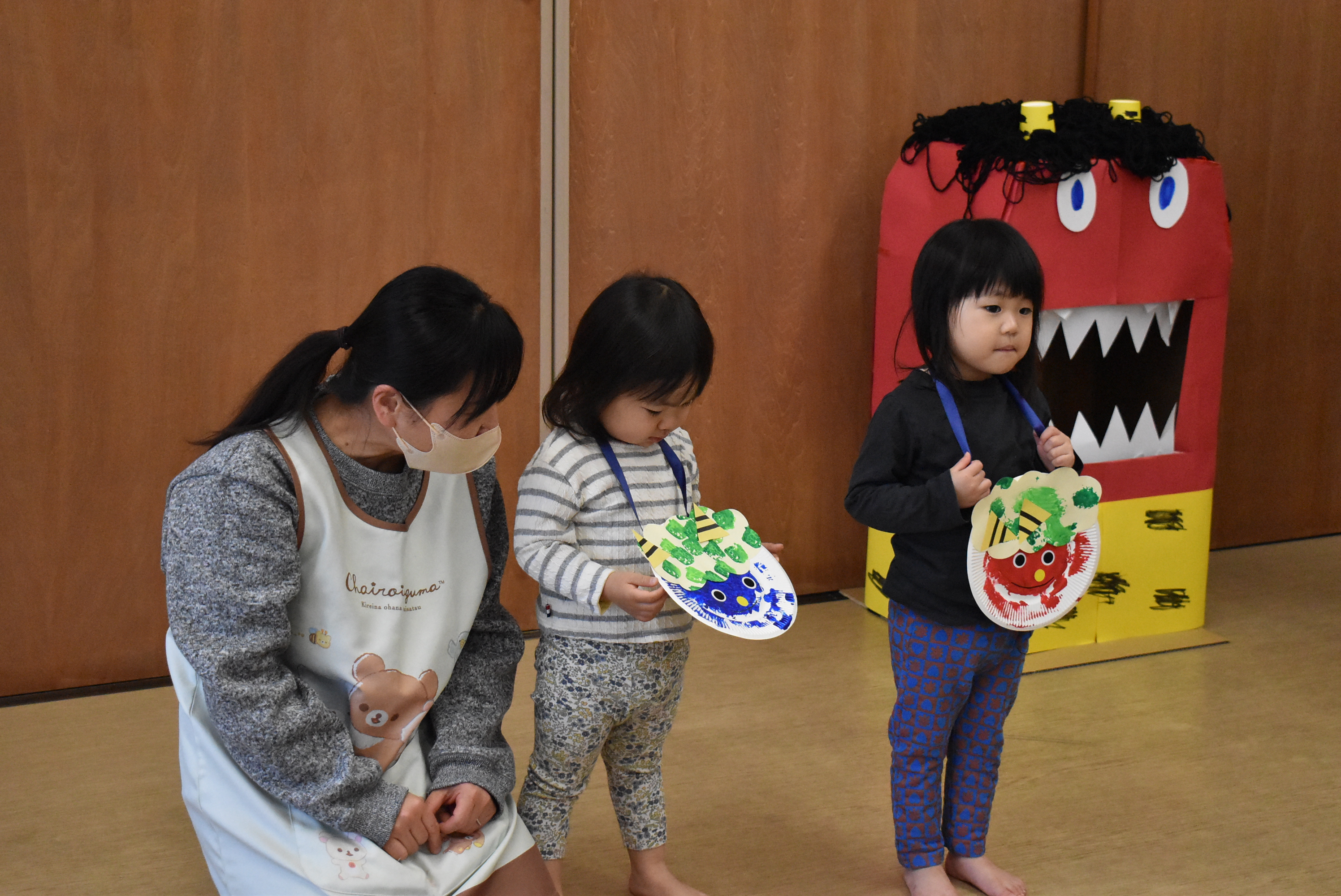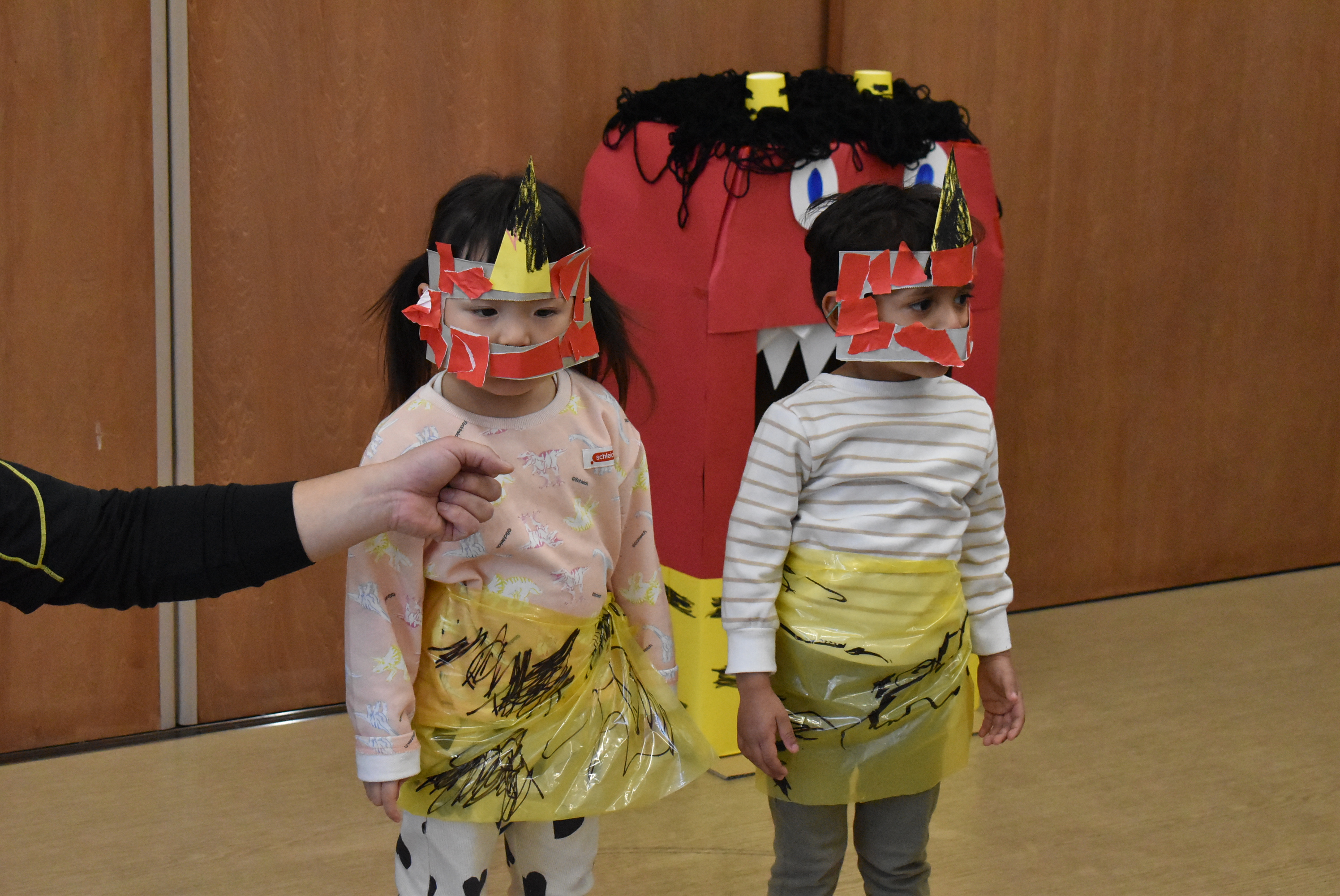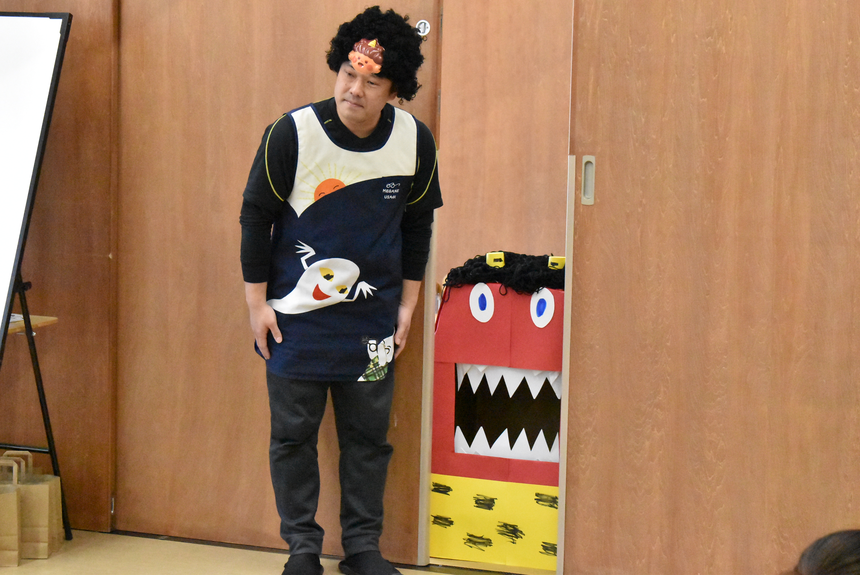 節分の話を聞いた後、扉の向こうから現れた『おにじろうくん』にみんな大笑い。