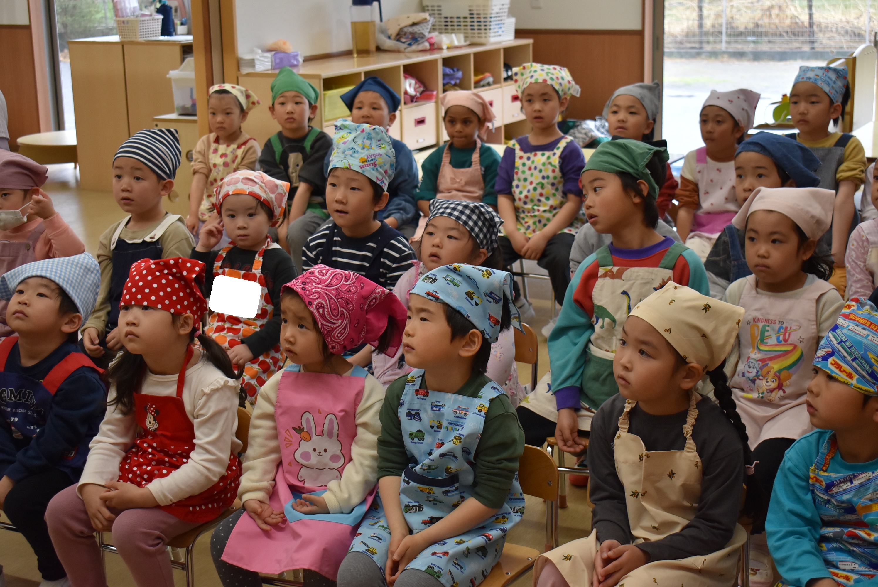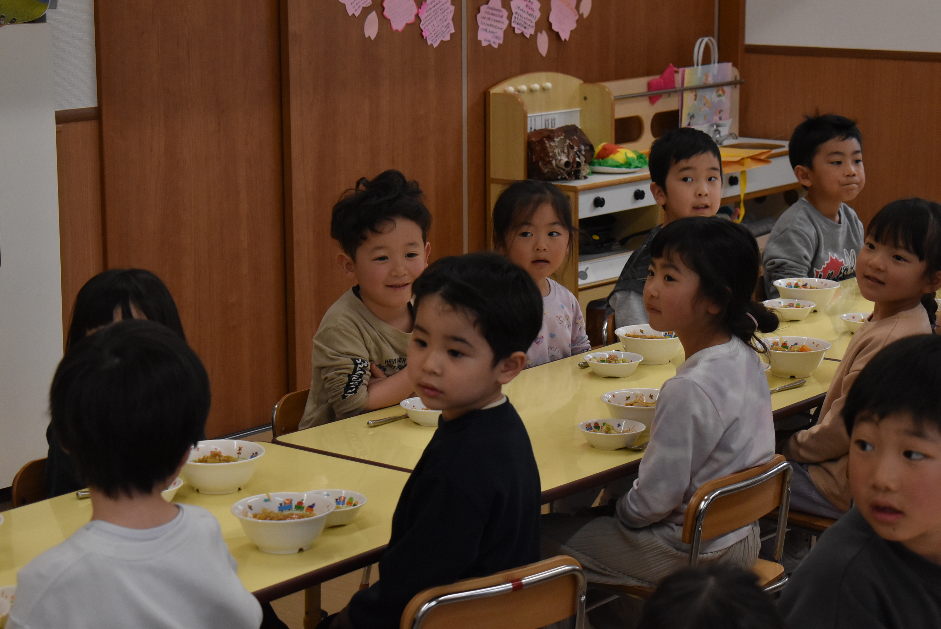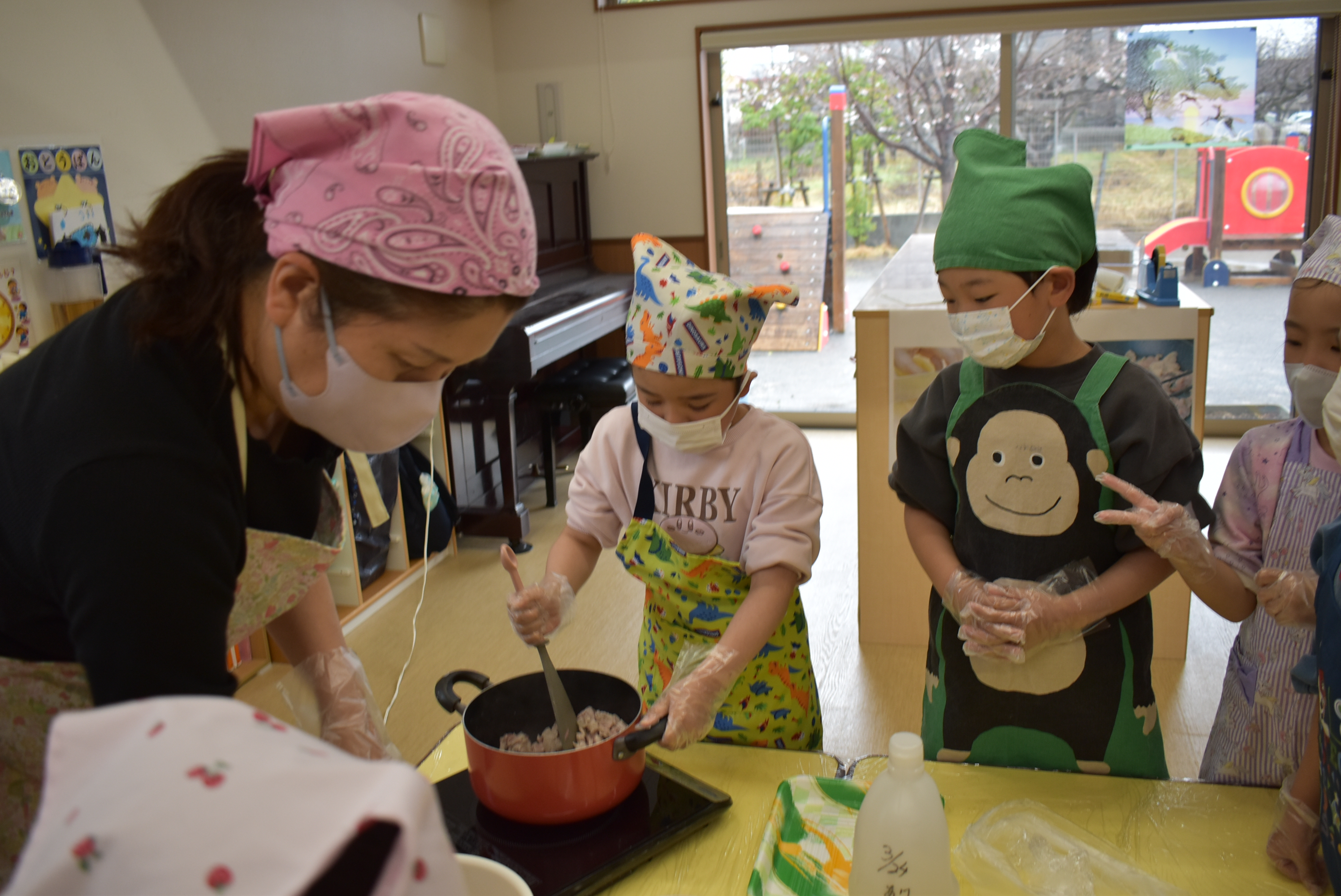 3月の食育活動は、おひさま組のお子様たちが食べたいメニューをみんなで作って食べる「リクエスト給食」を行いました。