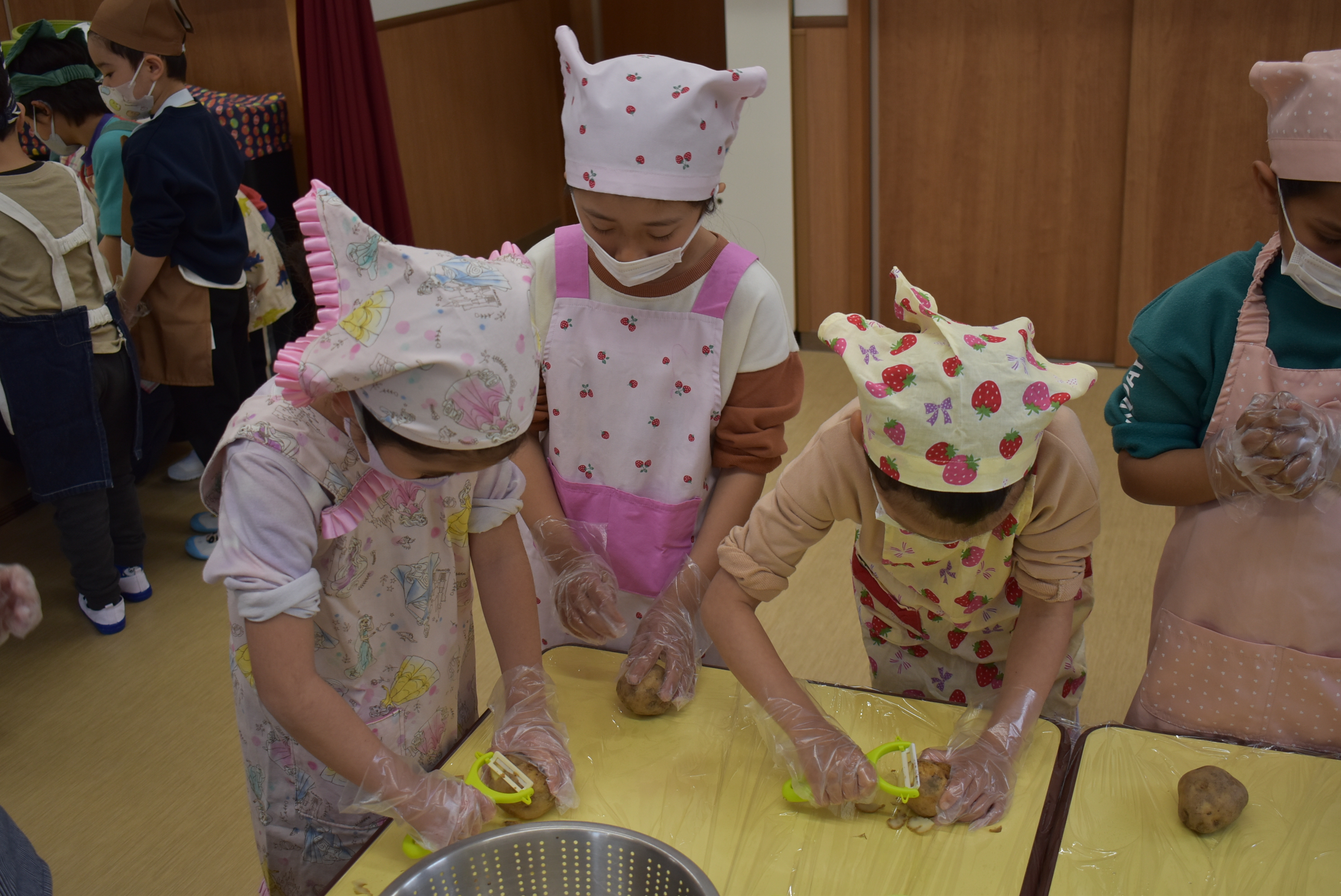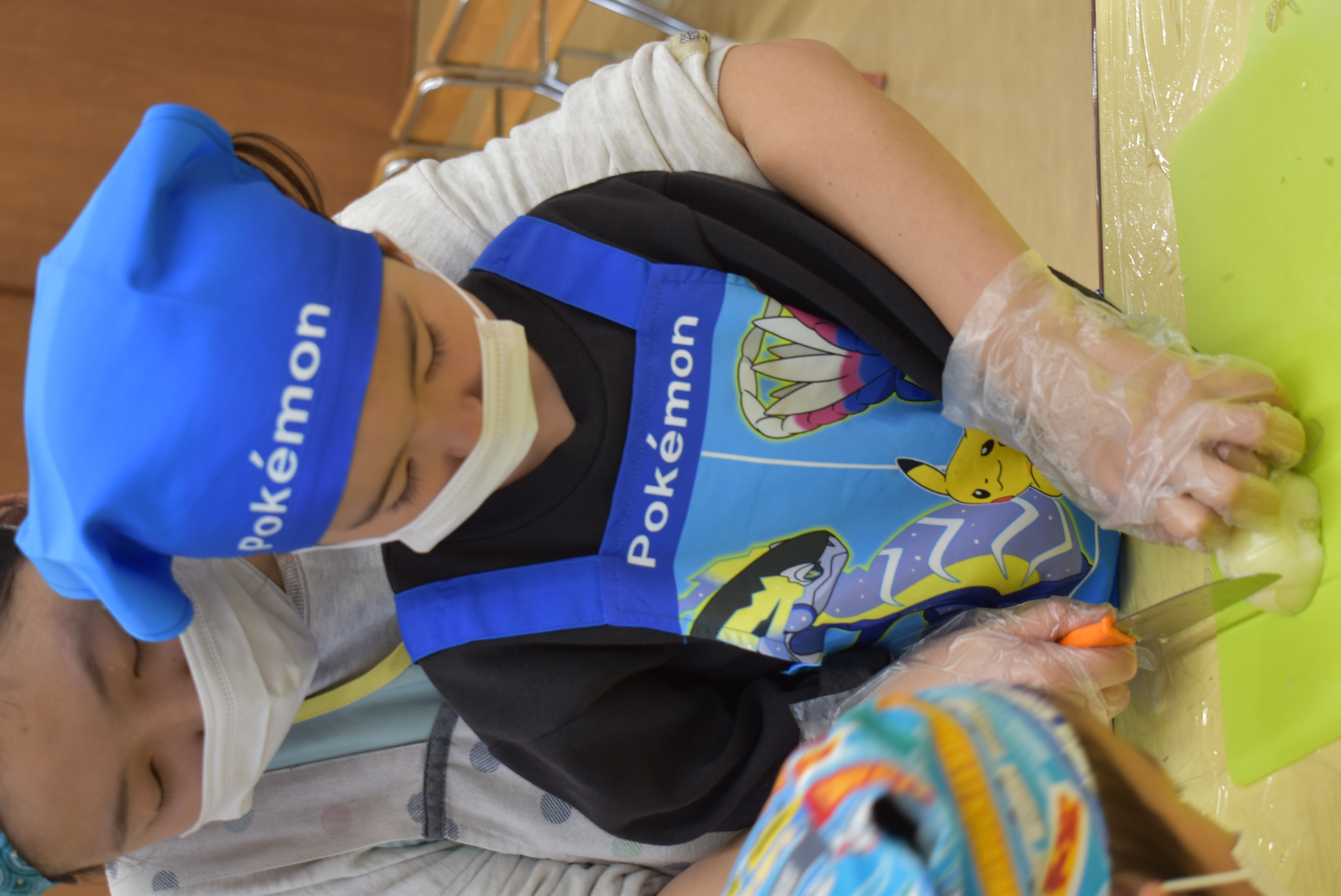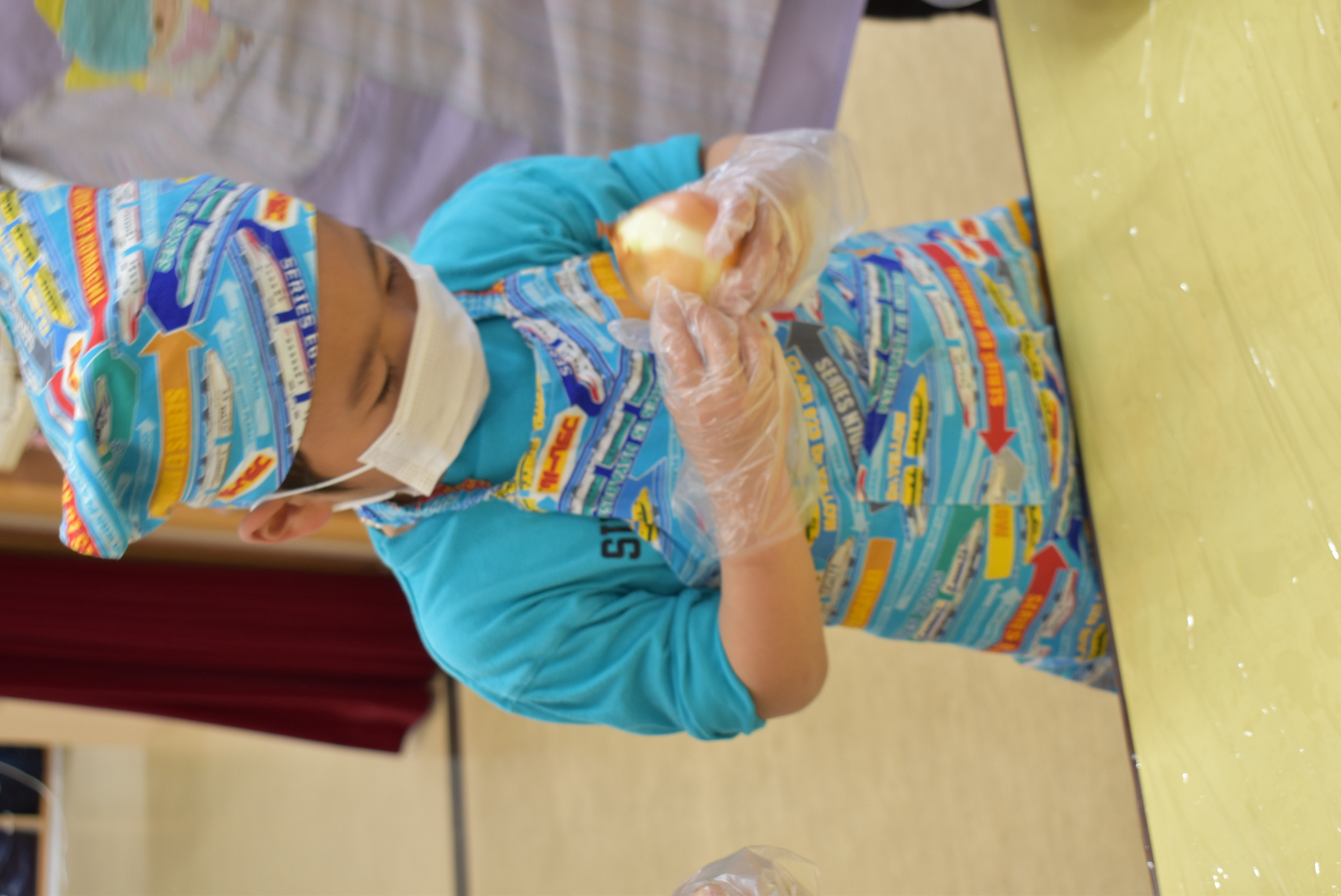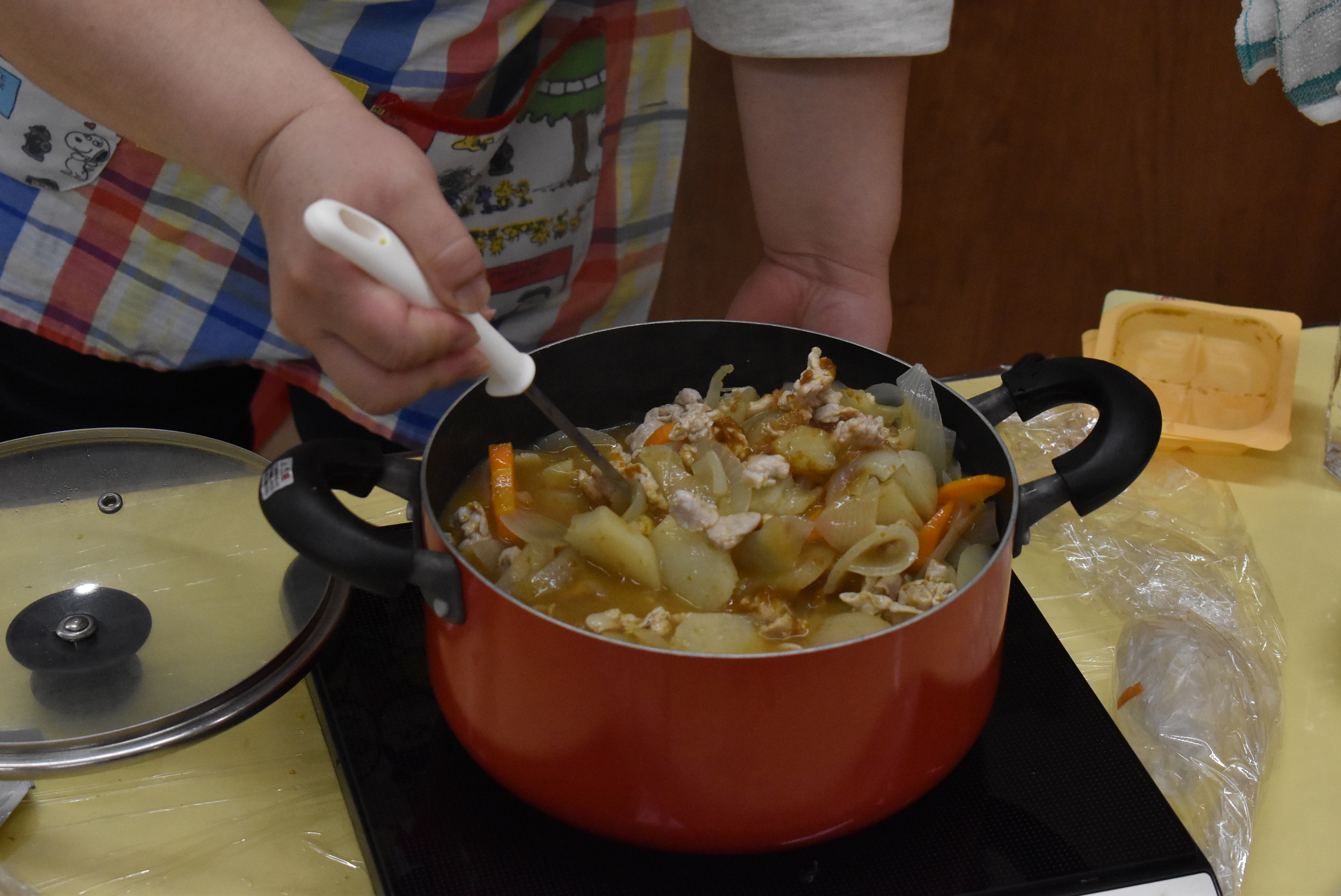 ひかり組、にじ組、おひさま組で協力して、カレーライス、サラダ、フルーチェを作りました。