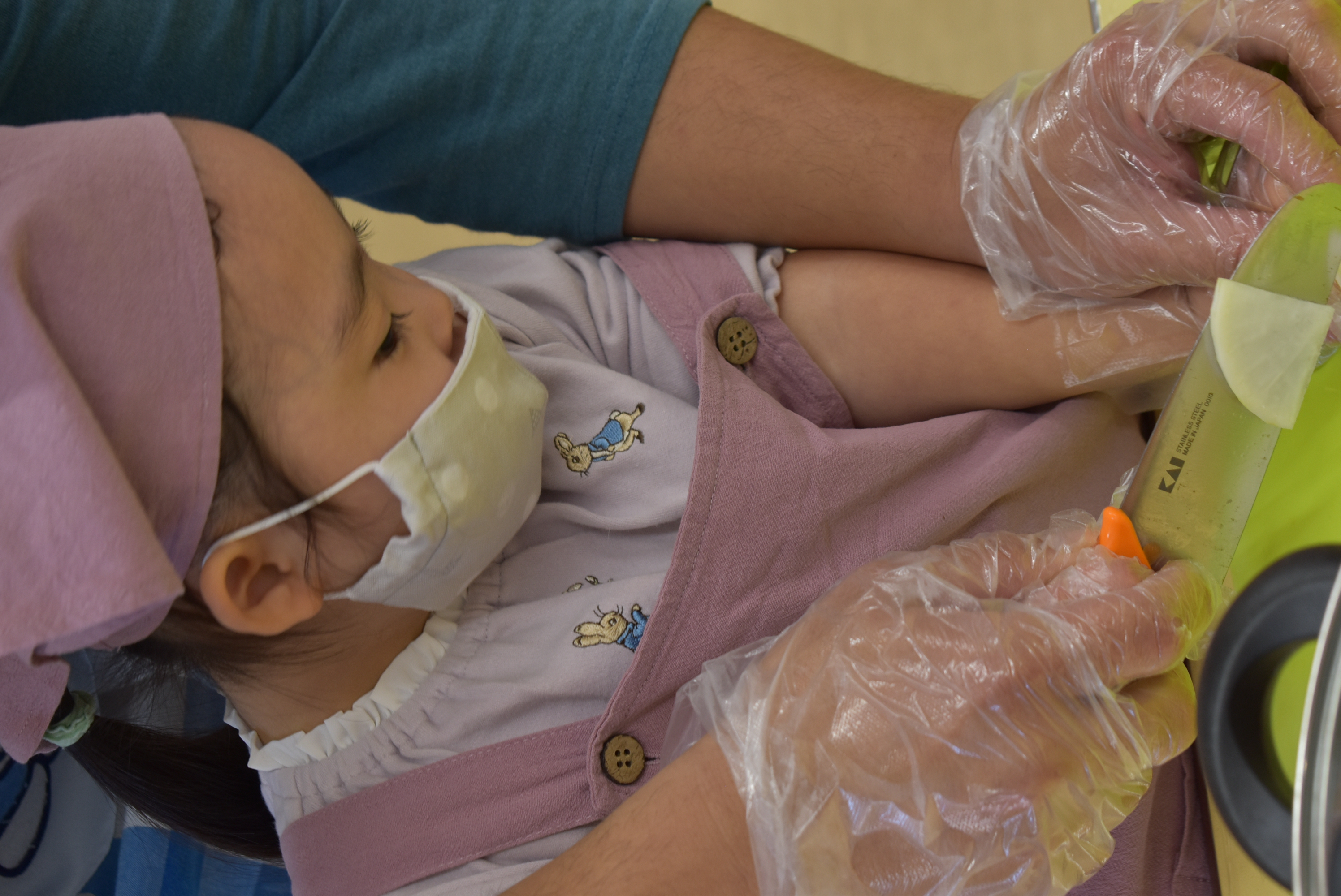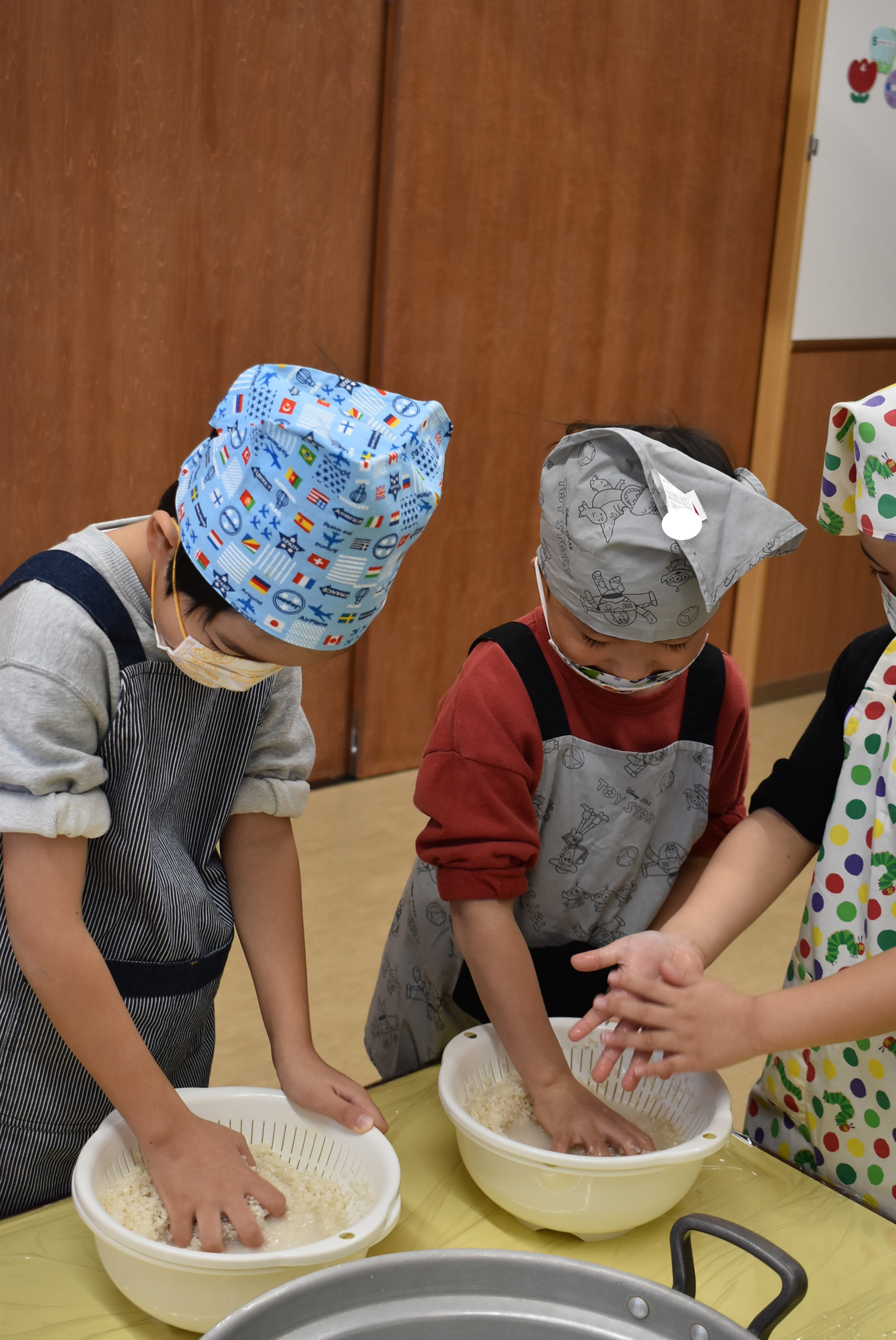 食育活動が始まる前におひさま組がお米を研いでくれました。