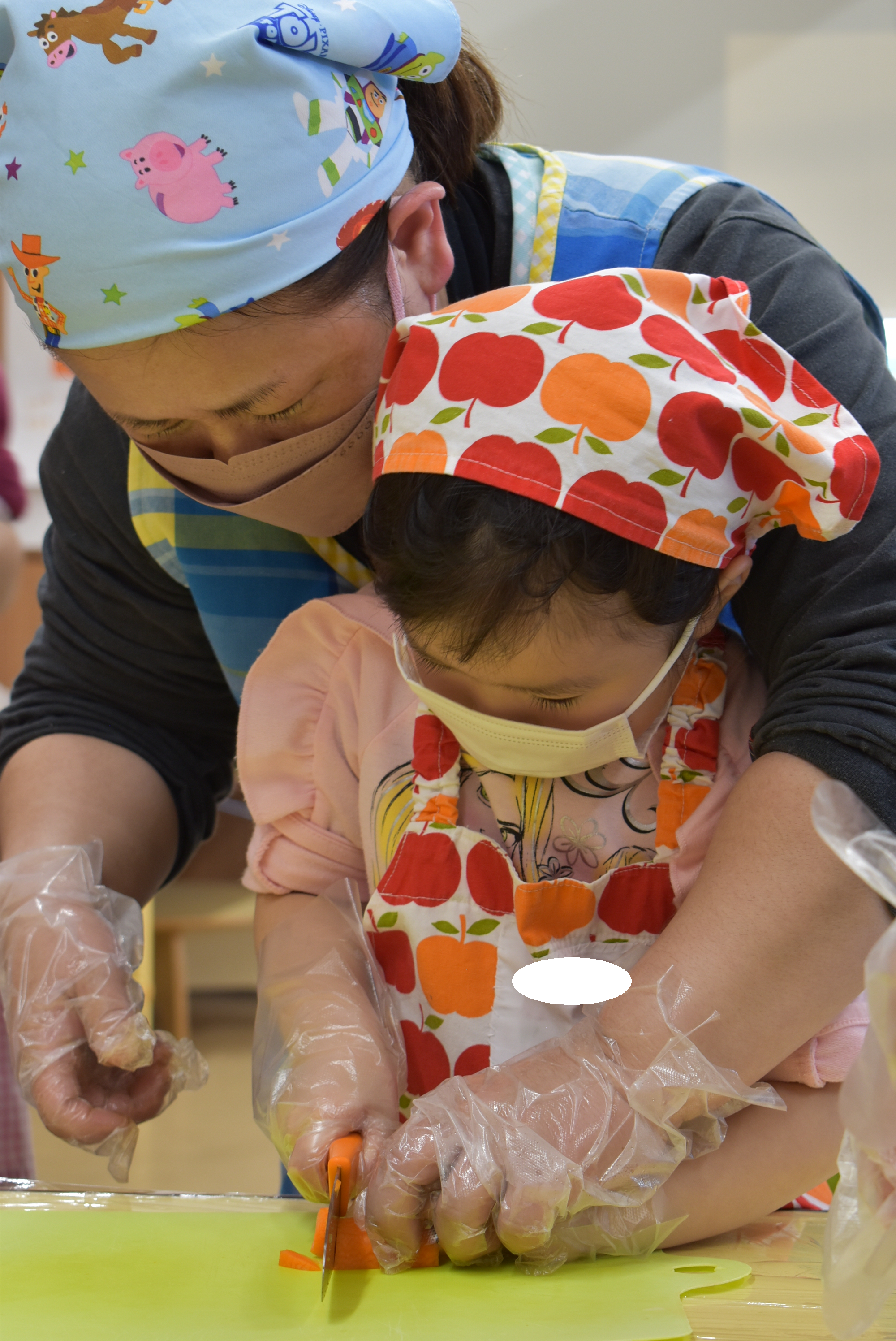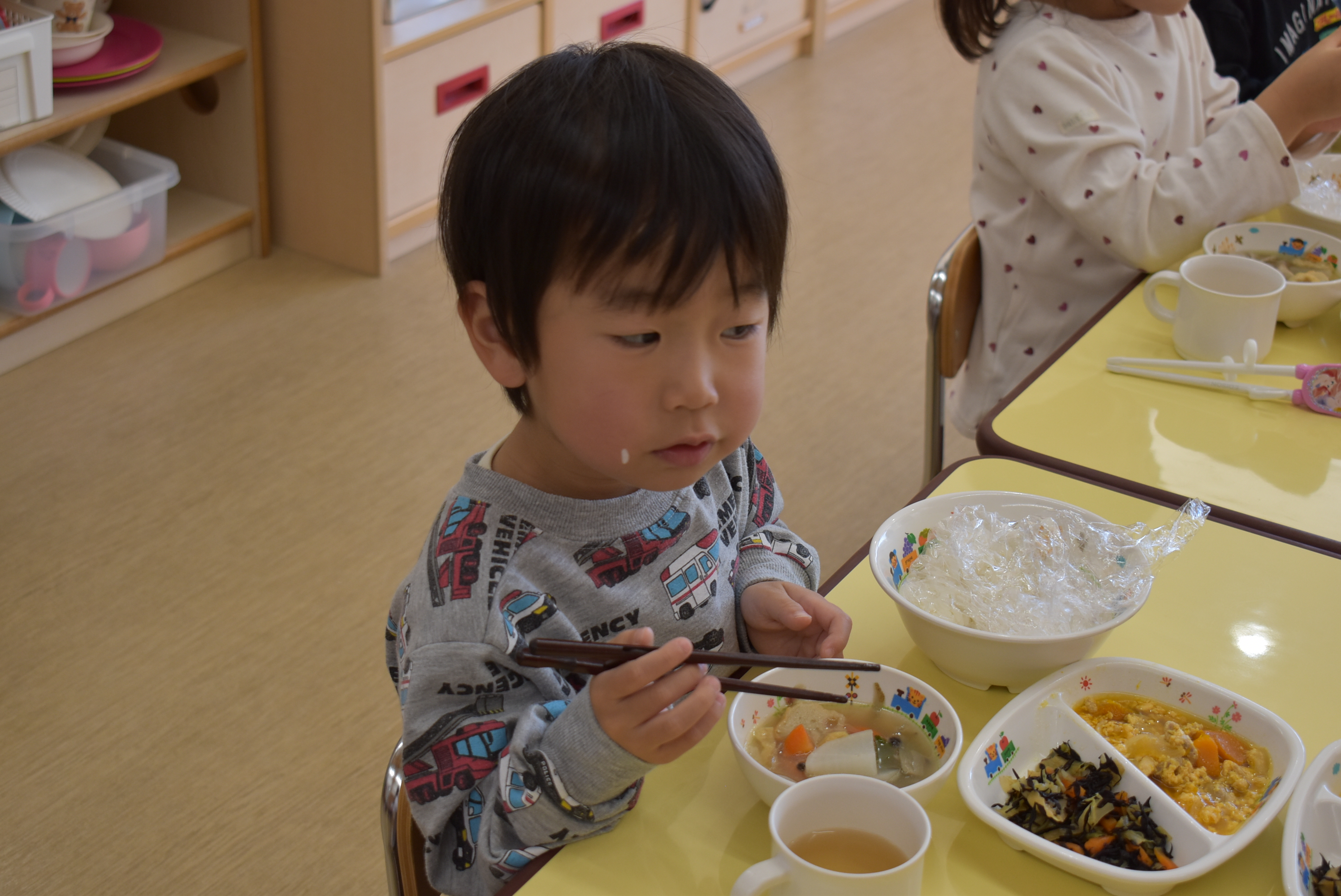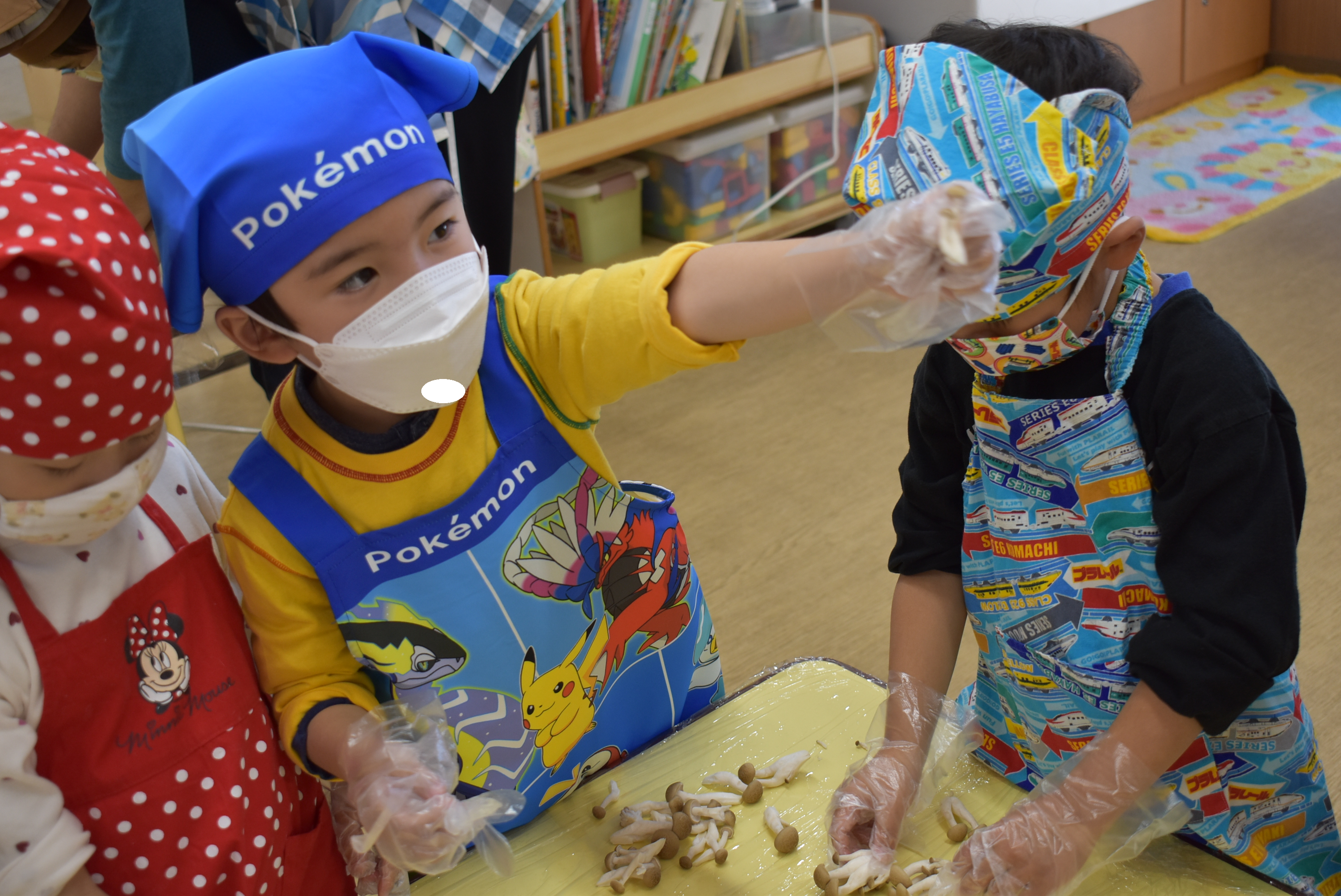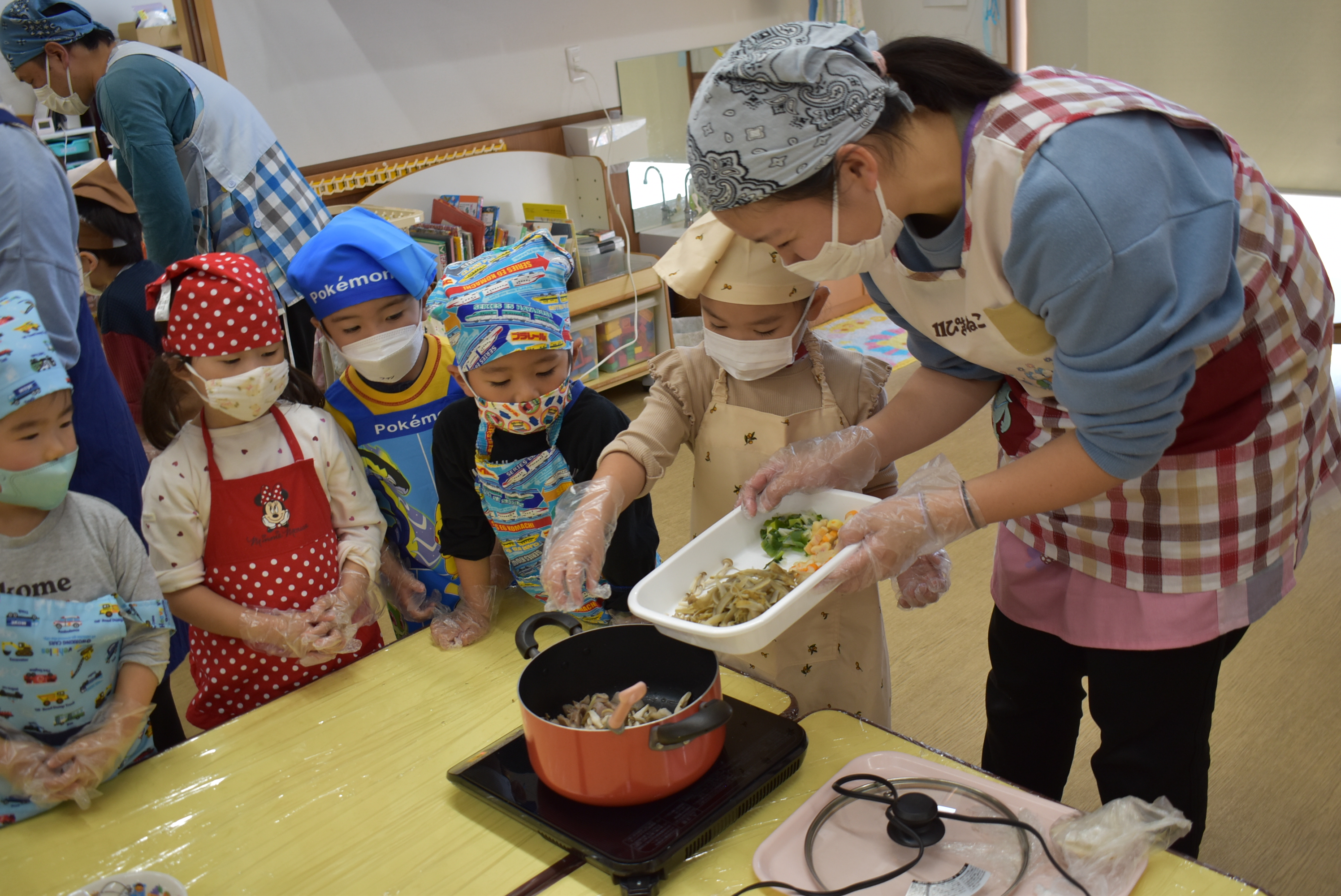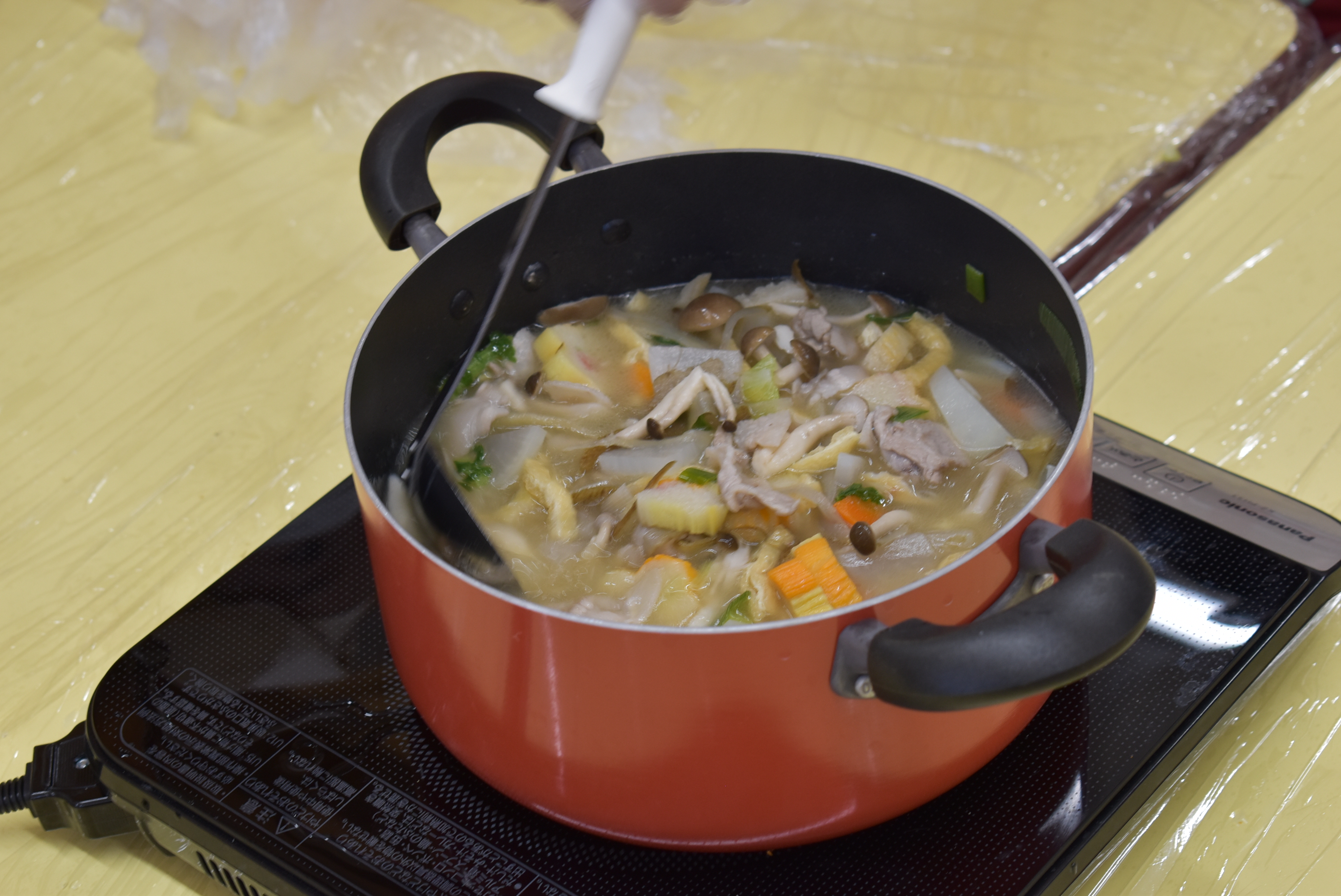 お子さま達で協力して完成させた豚汁を、自分でにぎったおにぎりと一緒においしく食べました。